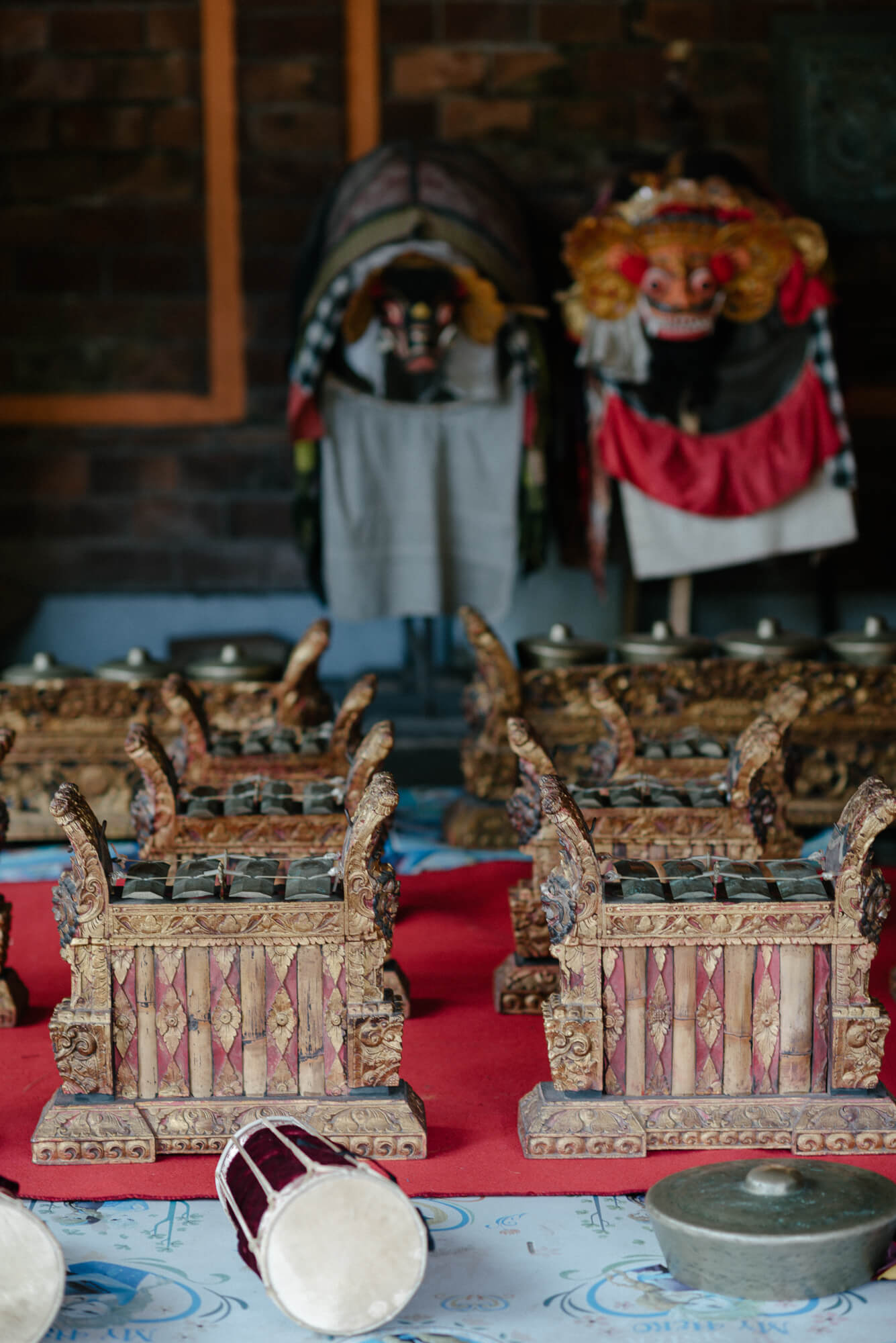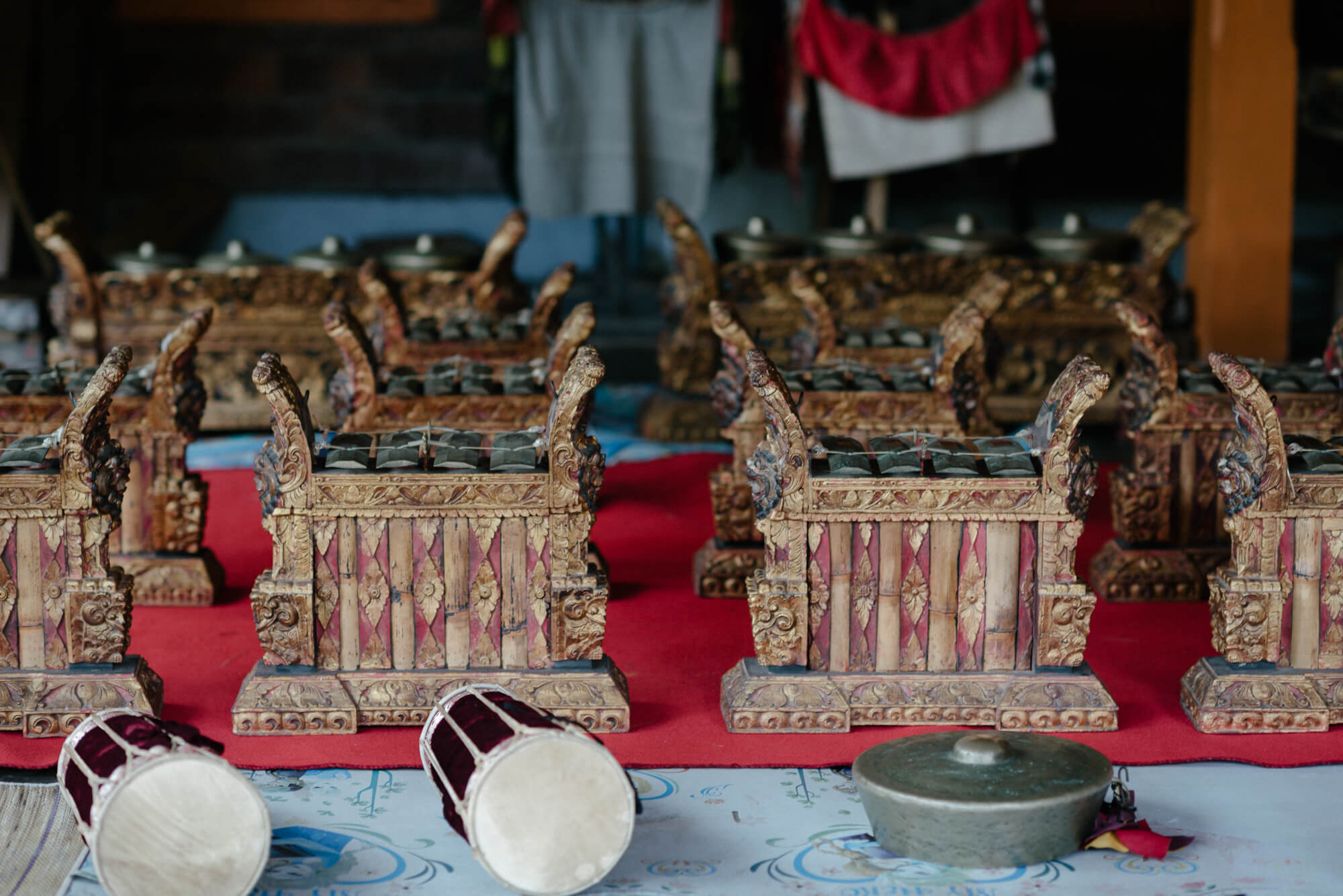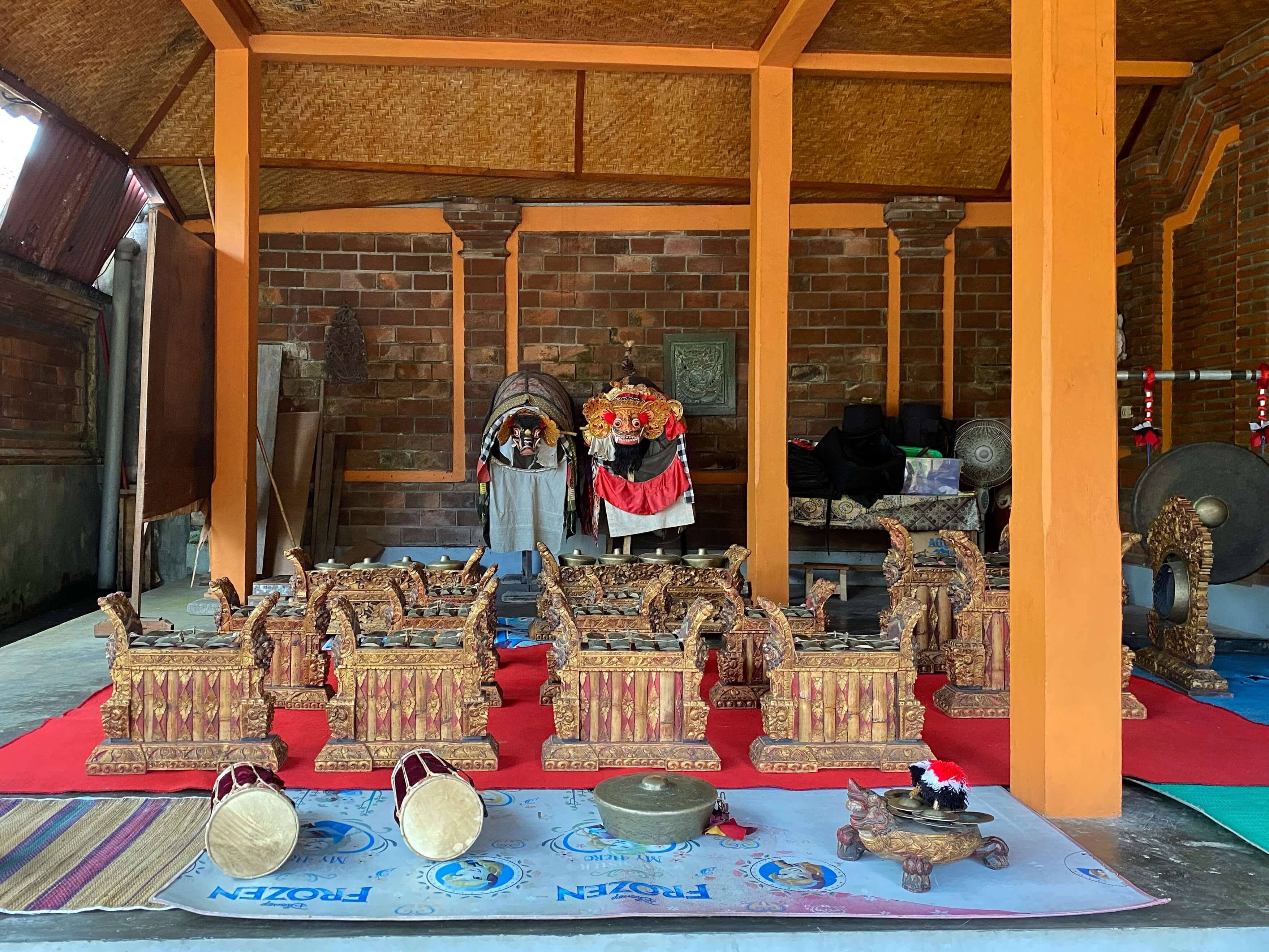 Ketut Madra’s son, Madé Berata, now 55, a gender wayang and gamelan angklung musician, also teaches wayang painting, religion, and other subjects at ISI Denpasary. Closer to home, he ensures that the young people in his banjar have the opportunity to learn traditional Balinese gamelan and flute. The instruments of the Balinese gamelan angklung (above) are smaller, easier to play, and more portable than those of the full gong kebyar ensemble. They are ideal first instruments for beginners learning to play.